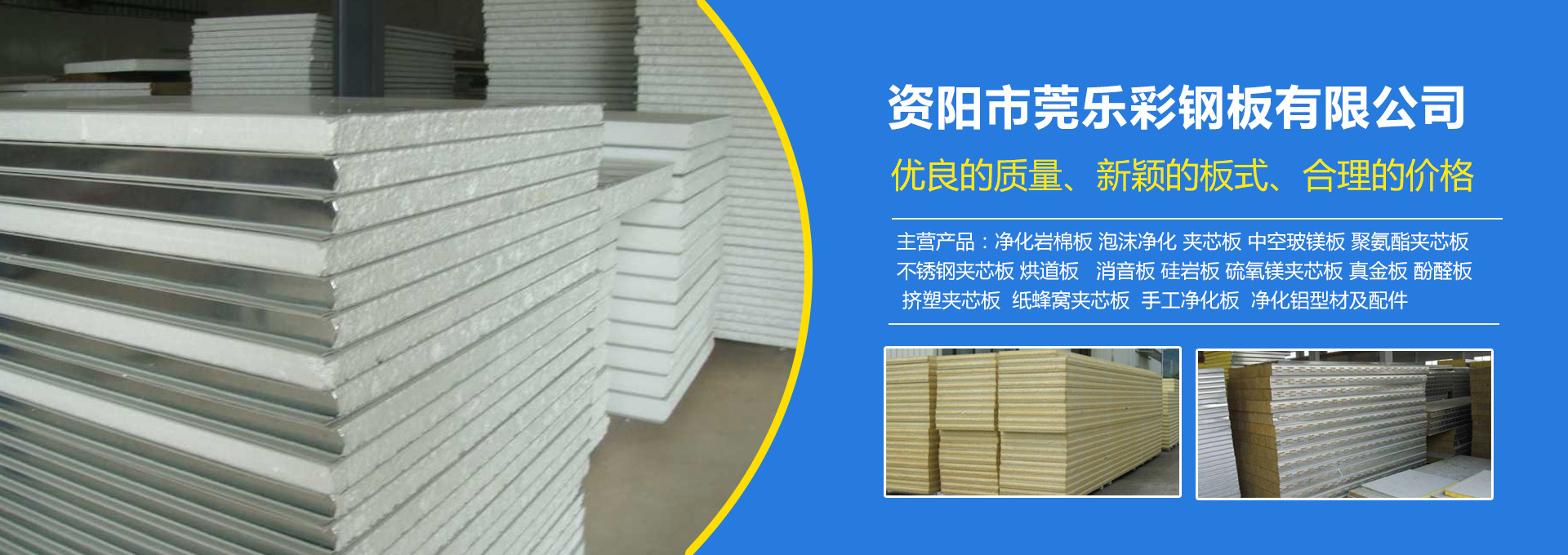 資陽市莞樂彩鋼板有限公司成立于2017年03月08日,位于資陽市樂至縣西郊工業園,廠區占地面積2500多平方,擁有多條彩鋼板生產線。交通十分便利,地理位置優越。公司從事凈化巖棉板、泡沫凈化夾芯板、中空玻鎂板、聚氨酯夾芯板、不銹鋼夾芯板、烘道板、音板、硅巖板、硫氧鎂夾芯板真金板、酚醛板、擠塑夾芯板、紙蜂窩夾芯板、手工凈化板、凈化鋁型材及生產和銷售的新型建材企業。擁有一批專業過硬、作風穩健的生產技術人員和經營管理精英,公司內部良好的組織氛圍、優良的企業文化和科學的經營管理,使公司成為一家活力的現代化經營企業。